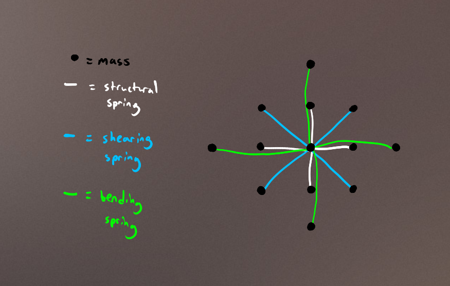 In this part, we set up the basic model for our cloth that allows us to build upon it. We built a model based on a grid of masses and springs where the cloth is divided up into evenly spaced point masses connected with springs. To implement this, we first created the correct number of masses based on our cloth dimensions, assigned them positions (with a small offset if the cloth is vertical), and added those point masses in row-major order to a point_masses vector. Pinned masses were also set up. Then, springs with specific spring types were created between each appropriate pair of point masses (with pointers).