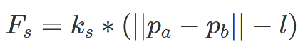 where ks is a spring constant, where larger values simulate "stiffer" springs (return to rest faster), p_a and p_b are the positions of masses attached to the springs, and l is the spring's rest length.