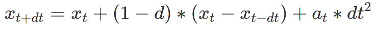 where t+dt is the next time step, d is a damping constant (more means more damping/less movement), t-dt is the previous time step, a_t is acceleration (calculated using F=ma), and dt is the time step.